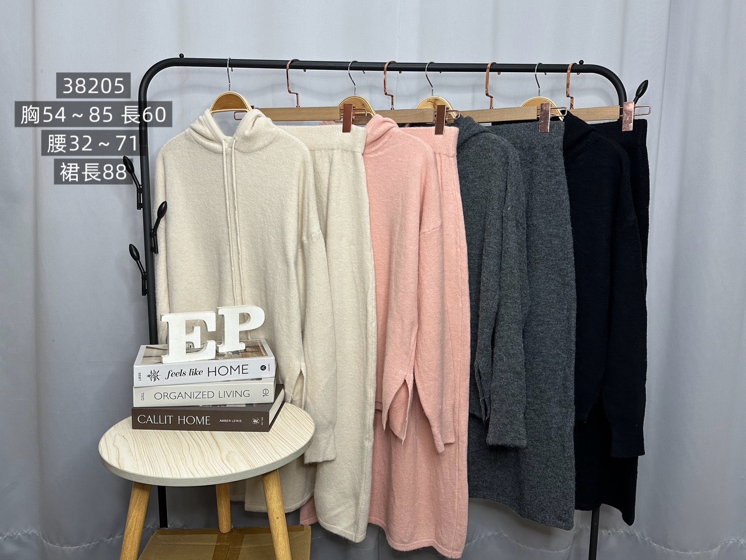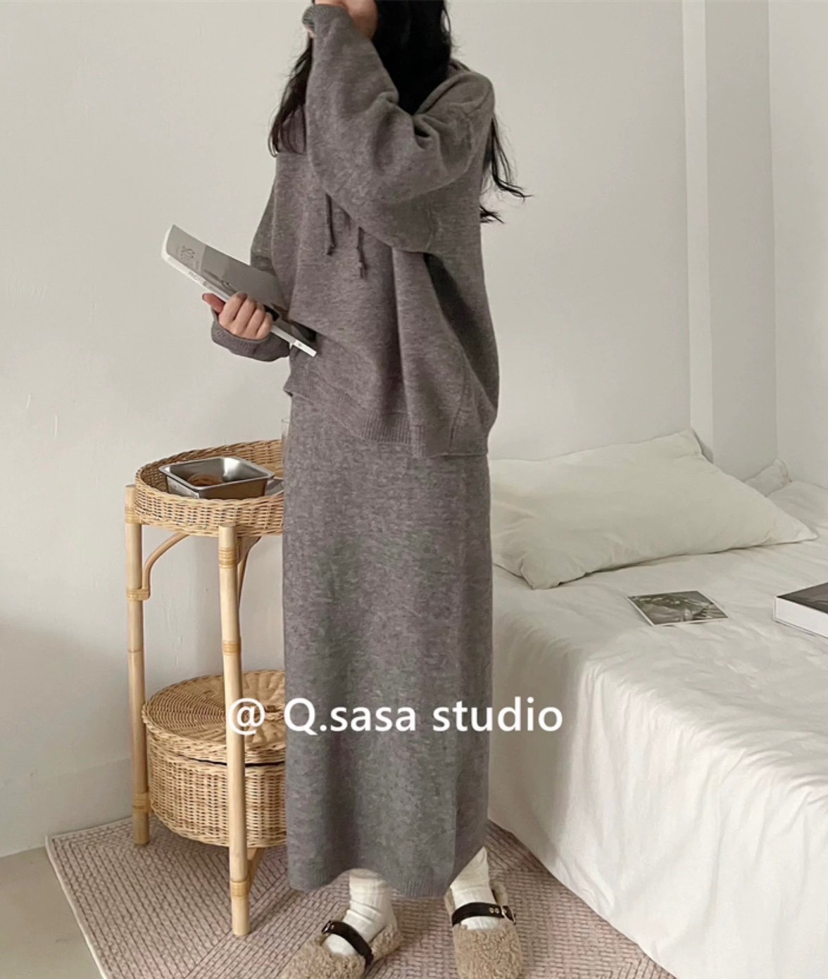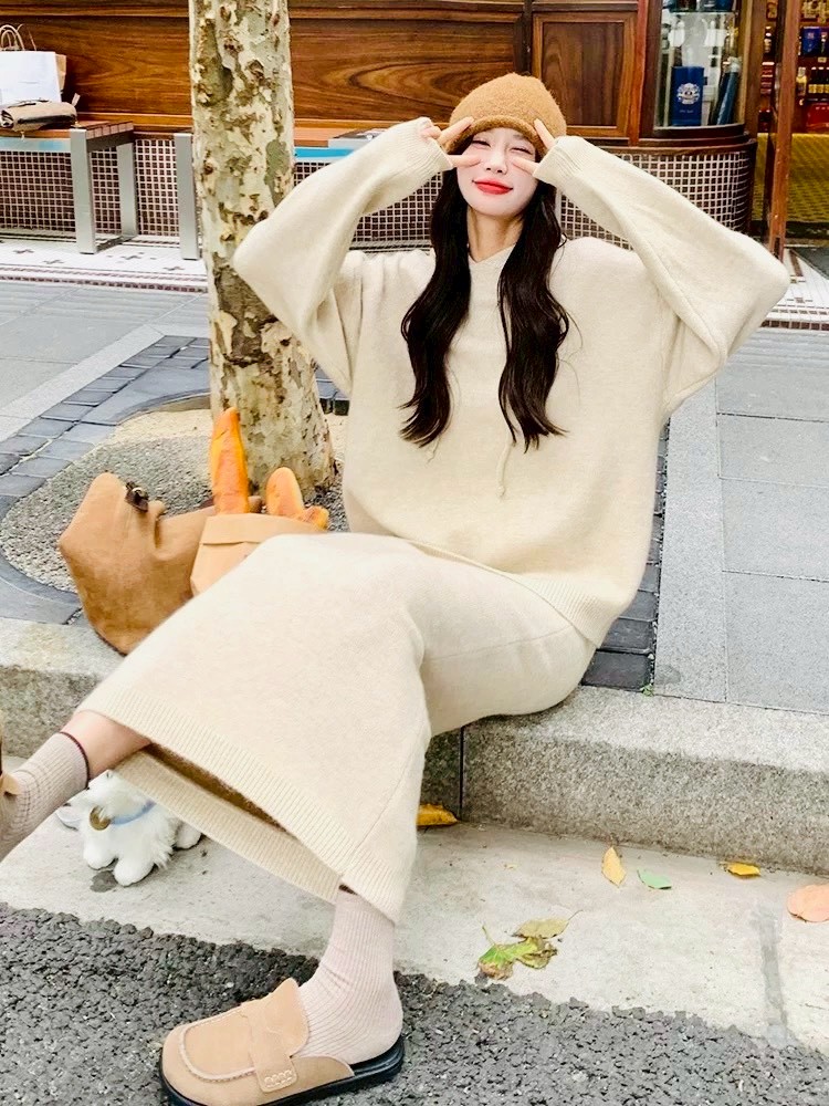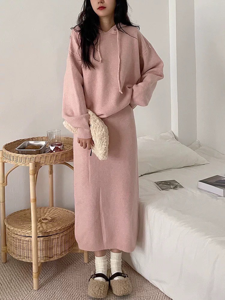 休閒針織套組綿羊絨帽T+中裙-4色