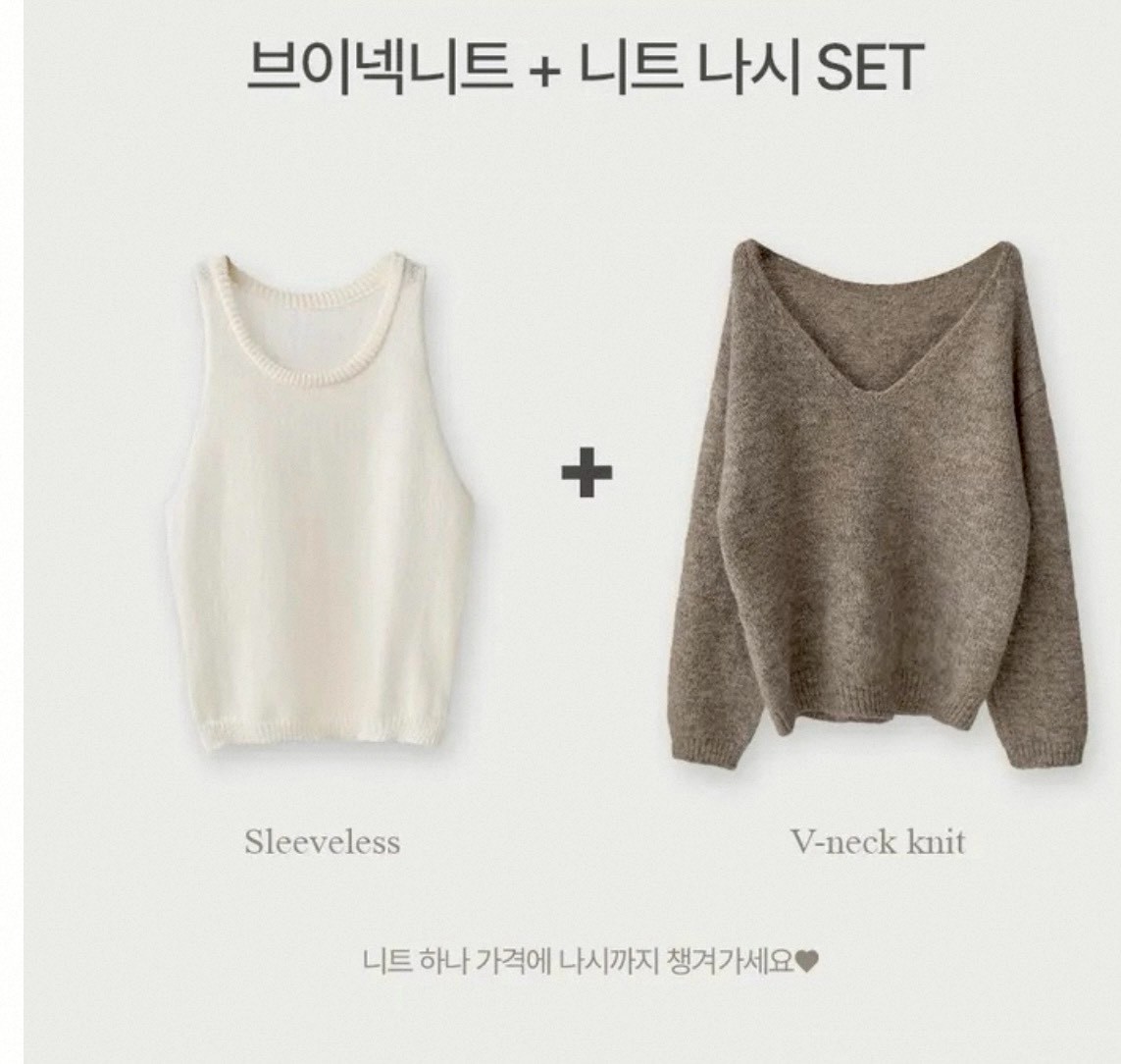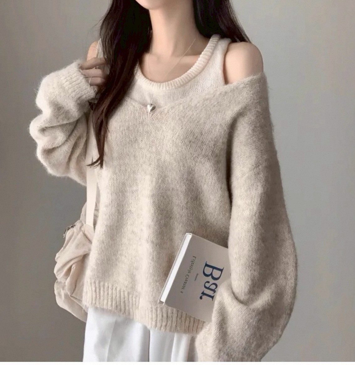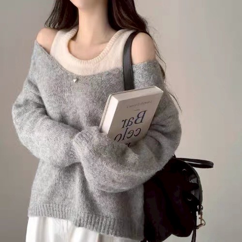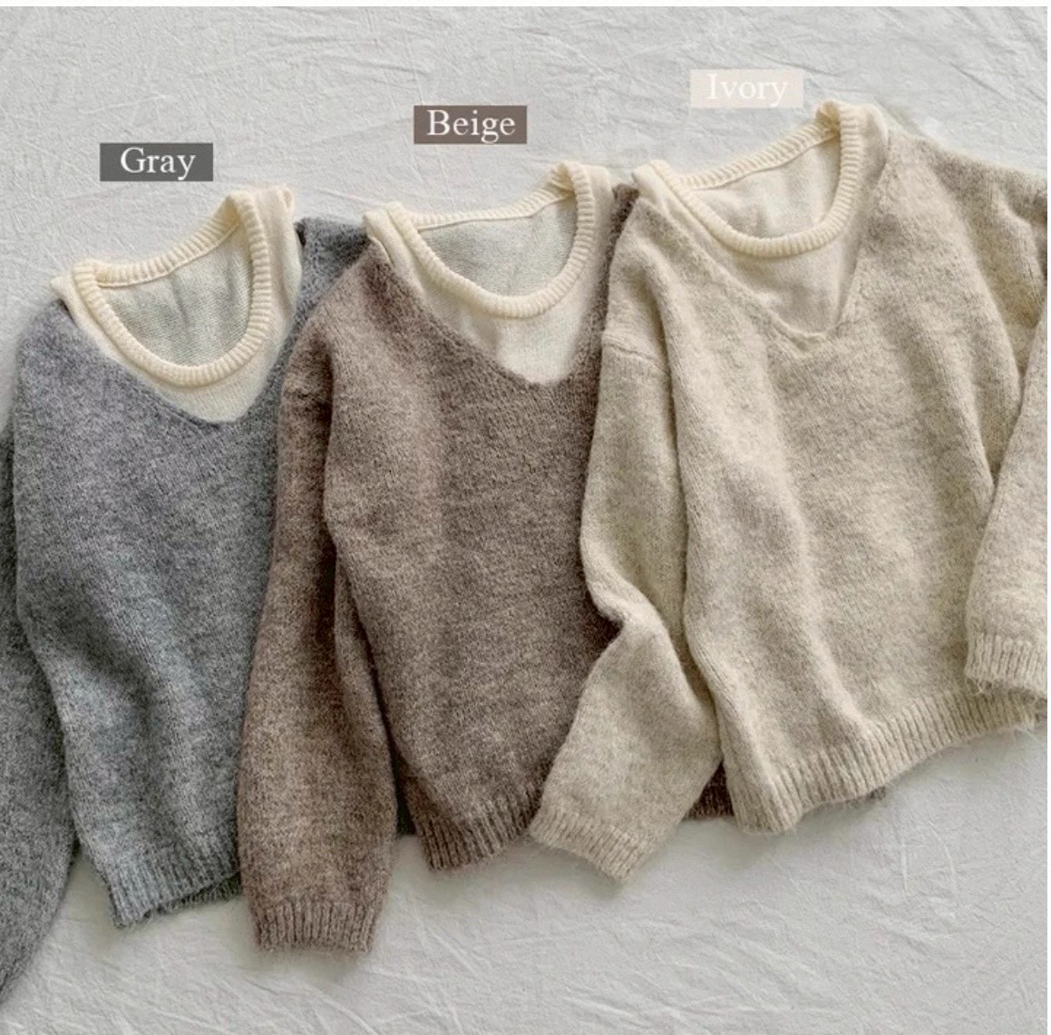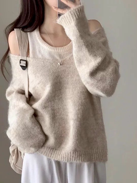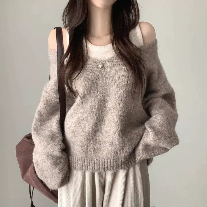 V領露肩羊毛絨毛衣+背心二件組-3色