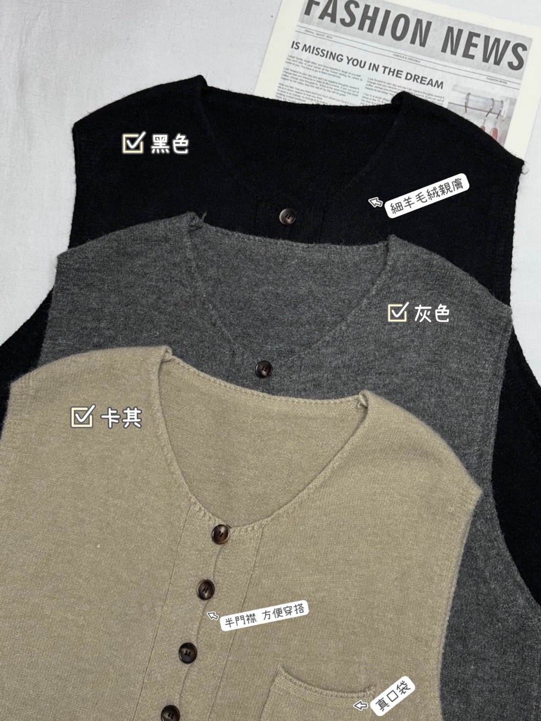 排扣軟糯羊毛絨背心洋-3色