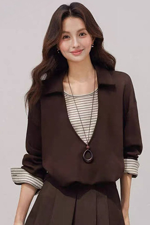 條紋氣質假兩件太空棉質上衣-3色