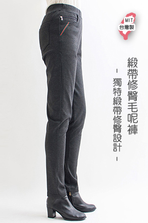 折100再打9折-台灣製緞帶修臀毛呢修身褲(M-3L)